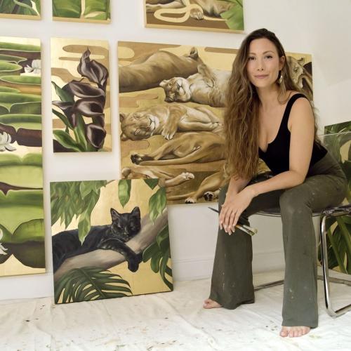 Gillian Lahav is a self-taught oil painter and gilder. Her paintings are inspired by nature's magic, featuring slumbering animals and lush plants set in golden light.